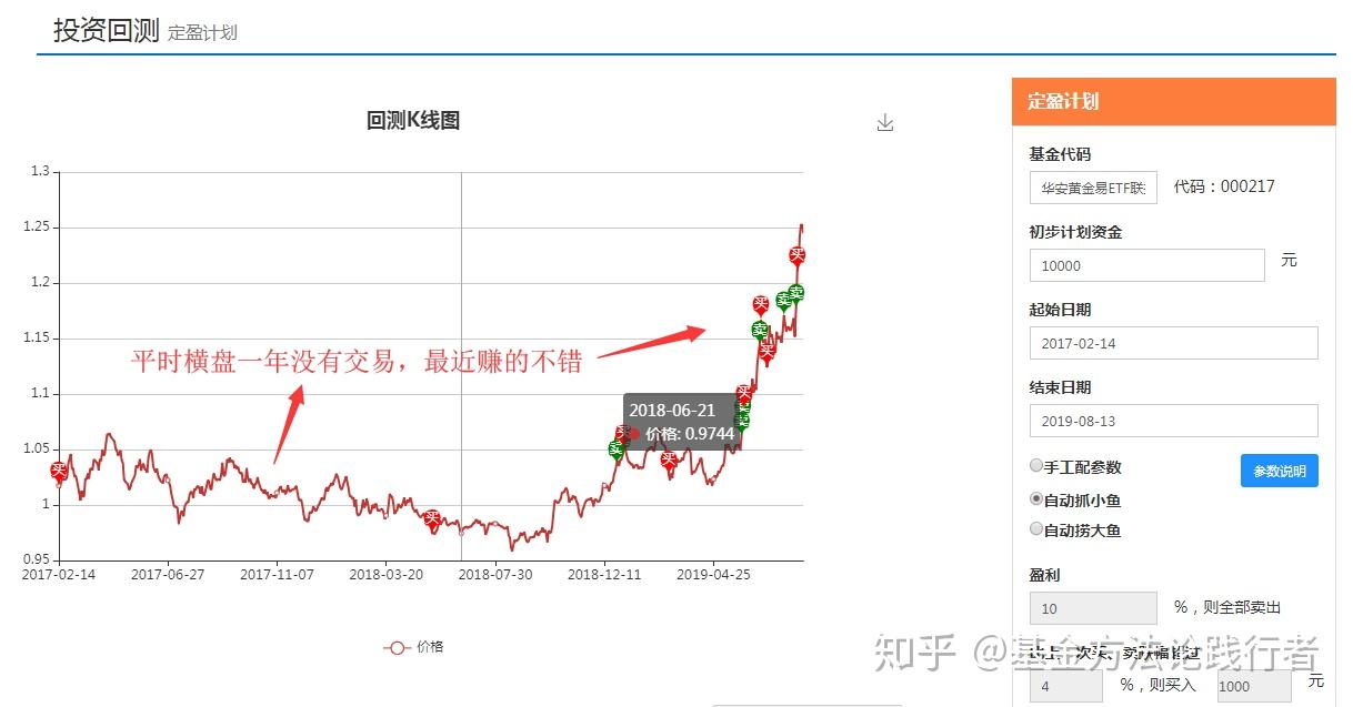 分析黄金ETF基金最近5年的走势,涨跌相对平稳,这次涨幅20%已经算是大涨了,价格相对稳定,反正是系统监测的,有钱赚就赚点,我的执行计划是: