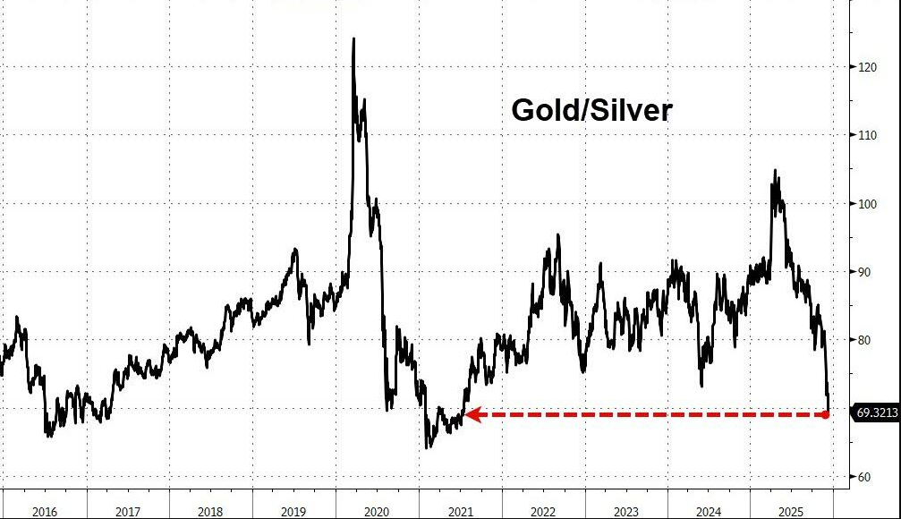 作为对比,尽管黄金今年也上涨了60%并突破4200美元大关,但在涨幅力度上仍逊色于白银,导致金银比价降至70倍以下,为2021年7月以来首次。